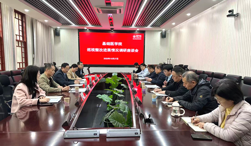 10月27日,巡视工作办公室主任朱恪川带队到基础医学院调研校内巡视整改工作进展情况。基础医学院党委书记马宏峰主持座谈会,纪检监察机构、巡视工作办公室、党委组织部相关负责人,基础医学院院长高成江等领导班子成员参加座谈交流。